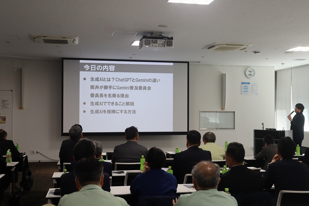 まず初めに「AI活用講座 実演!生成AIでできること」と題し株式会社Carpe Diem 代表取締役 阪井裕樹様にご講演頂きました。「生成AIとは何?」の初歩から活用の仕方「ChatGPT」と「Gemini」の違い、言語化能力を磨くことが、結果的にAIの性能を最大限に引き出す鍵であることをお話しくださいました。大変分かり易いご講演に出席者はうなずくなどしながら聞き入っていらっしゃいました。